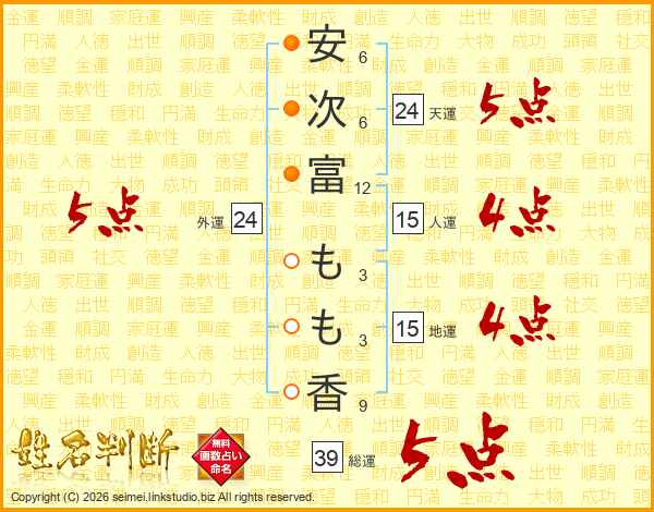 安(6画)次(6画)富(12画) も(3画)も(3画)香(9画)