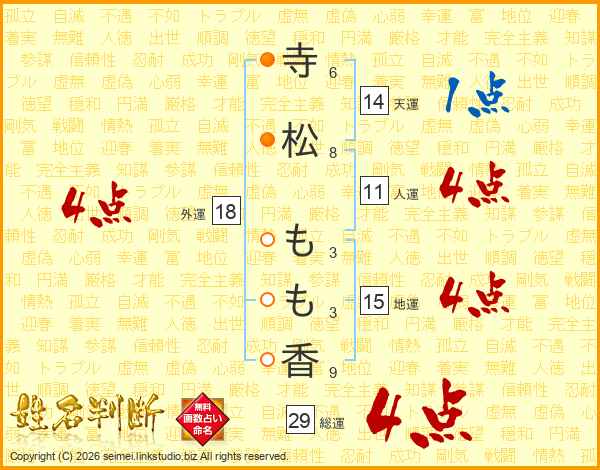 寺(6画)松(8画) も(3画)も(3画)香(9画)