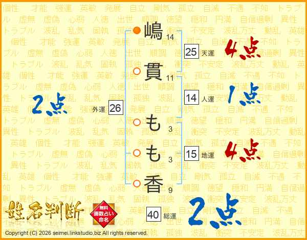 嶋(14画)貫(11画) も(3画)も(3画)香(9画)