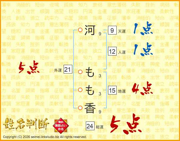 生活面を象徴する運勢です。外部から受ける影響力を表し、結婚運、家庭運や職場、環境への順応性を表します。総運から人運を引いた画数。姓や名が1文字の場合を除く。