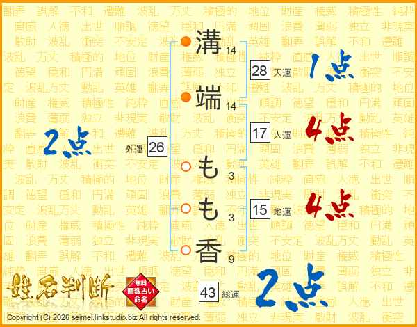生活面を象徴する運勢です。外部から受ける影響力を表し、結婚運、家庭運や職場、環境への順応性を表します。総運から人運を引いた画数。姓や名が1文字の場合を除く。