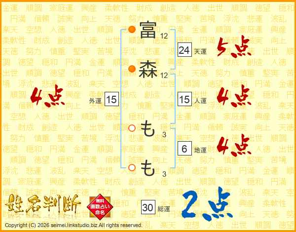 生活面を象徴する運勢です。外部から受ける影響力を表し、結婚運、家庭運や職場、環境への順応性を表します。総運から人運を引いた画数。姓や名が1文字の場合を除く。