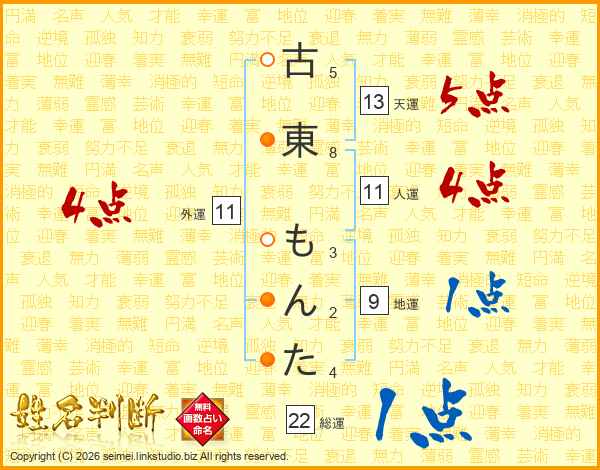 古東もんたさんの総運は22画の1点!
