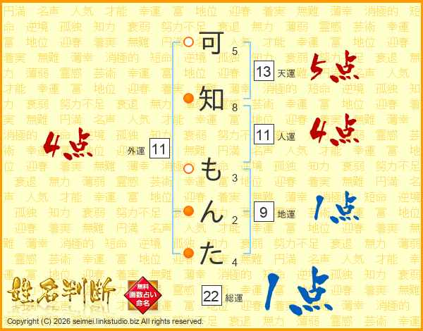 可知もんたさんの総運は22画の1点!