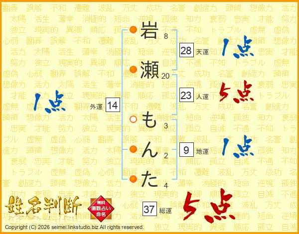 岩(8画)瀬(20画) も(3画)ん(2画)た(4画)