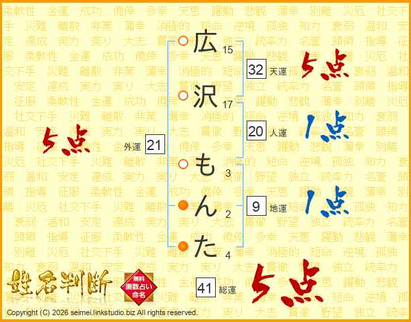 広沢もんたさんの総運は41画の5点!