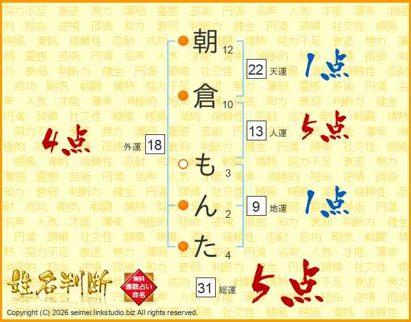 朝倉もんたさんの総運は31画の5点!