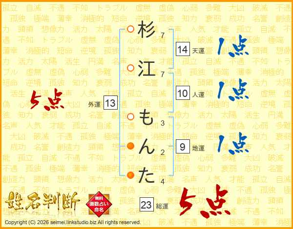 杉(7画)江(7画) も(3画)ん(2画)た(4画)
