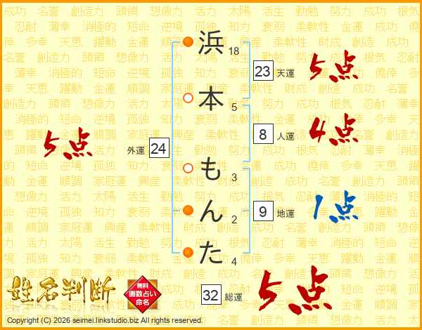 浜(18画)本(5画) も(3画)ん(2画)た(4画)
