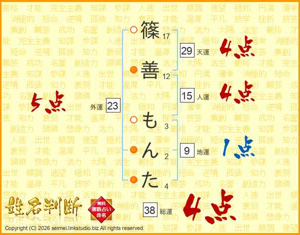 篠善もんたさんの総運は38画の4点!