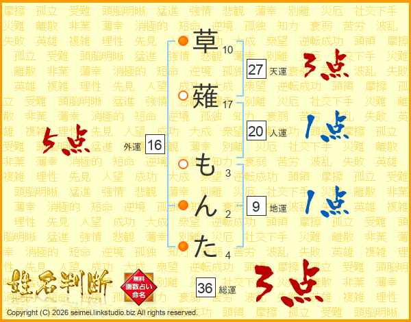 生活面を象徴する運勢です。外部から受ける影響力を表し、結婚運、家庭運や職場、環境への順応性を表します。総運から人運を引いた画数。姓や名が1文字の場合を除く。