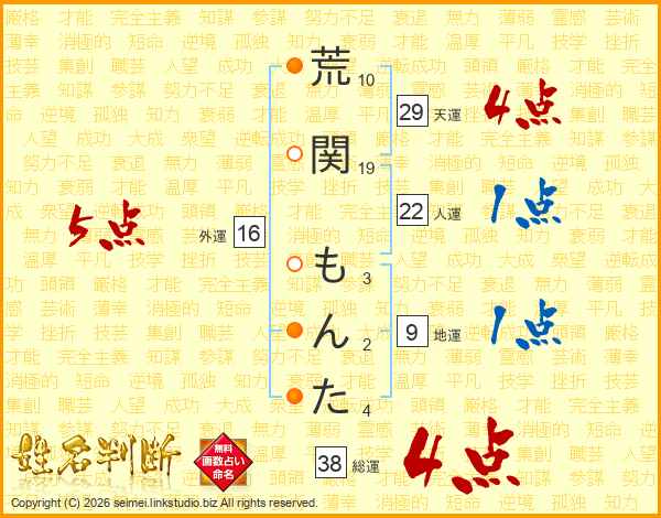 荒(10画)関(19画) も(3画)ん(2画)た(4画)