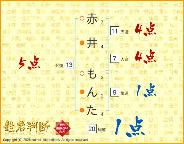 赤(7画)井(4画) も(3画)ん(2画)た(4画)
