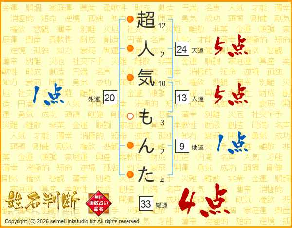 超(12画)人(2画)気(10画) も(3画)ん(2画)た(4画)