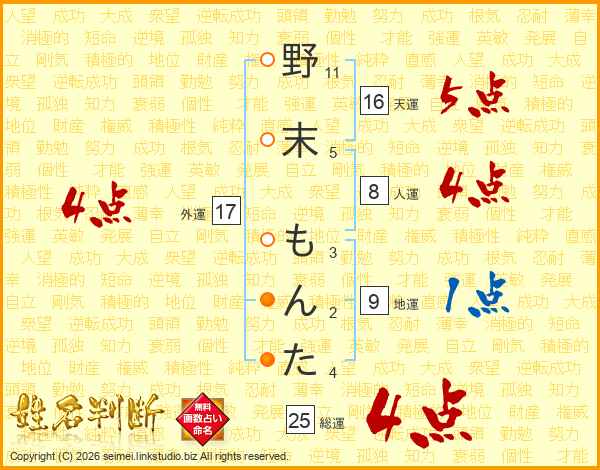 野末もんたさんの外運は17画の4点!