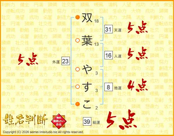 双(18画)葉(13画) や(3画)す(3画)こ(2画)