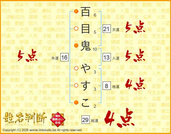 百(6画)目(5画)鬼(10画) や(3画)す(3画)こ(2画)