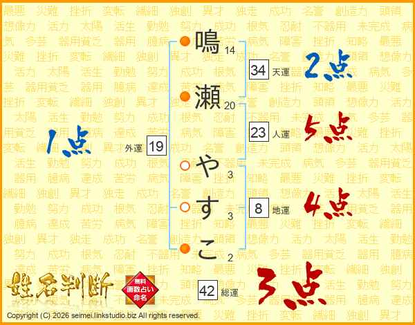 鳴(14画)瀬(20画) や(3画)す(3画)こ(2画)
