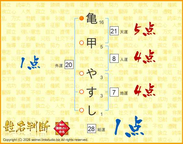 亀甲やすしさんの天運は21画の5点!