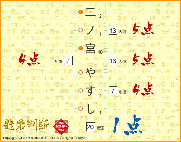 生活面を象徴する運勢です。外部から受ける影響力を表し、結婚運、家庭運や職場、環境への順応性を表します。総運から人運を引いた画数。姓や名が1文字の場合を除く。