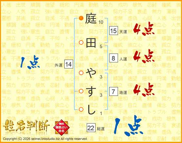 生活面を象徴する運勢です。外部から受ける影響力を表し、結婚運、家庭運や職場、環境への順応性を表します。総運から人運を引いた画数。姓や名が1文字の場合を除く。