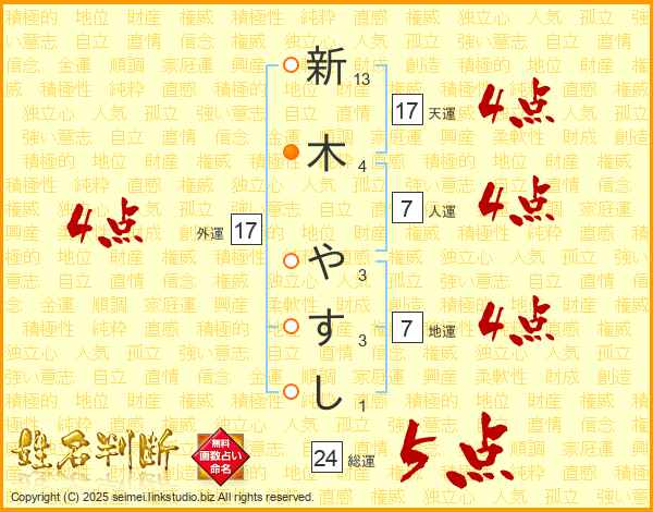新(13画)木(4画) や(3画)す(3画)し(1画)