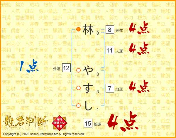 生活面を象徴する運勢です。外部から受ける影響力を表し、結婚運、家庭運や職場、環境への順応性を表します。総運から人運を引いた画数。姓や名が1文字の場合を除く。