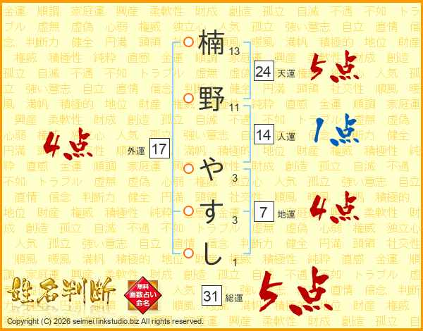 楠野やすしさんの総運は31画の5点!