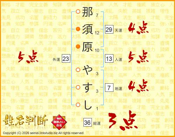 那(7画)須(12画)原(10画) や(3画)す(3画)し(1画)