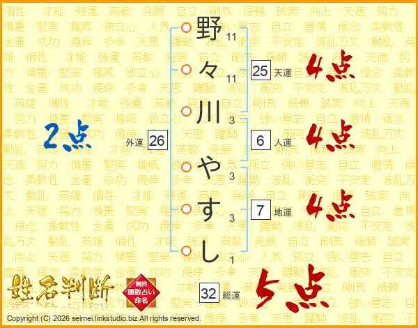 生活面を象徴する運勢です。外部から受ける影響力を表し、結婚運、家庭運や職場、環境への順応性を表します。総運から人運を引いた画数。姓や名が1文字の場合を除く。