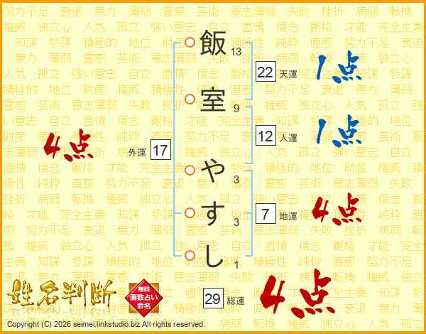 飯(13画)室(9画) や(3画)す(3画)し(1画)