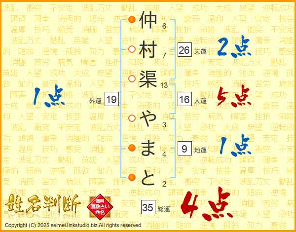 仲(6画)村(7画)渠(13画) や(3画)ま(4画)と(2画)