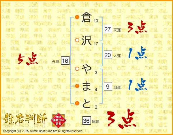 倉(10画)沢(17画) や(3画)ま(4画)と(2画)