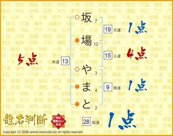 坂場やまとさんの総運は28画の1点!