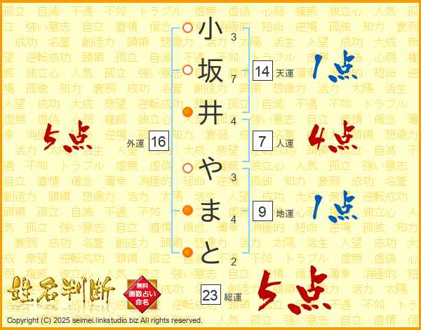 生活面を象徴する運勢です。外部から受ける影響力を表し、結婚運、家庭運や職場、環境への順応性を表します。総運から人運を引いた画数。姓や名が1文字の場合を除く。