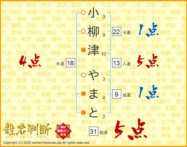 小(3画)柳(9画)津(10画) や(3画)ま(4画)と(2画)