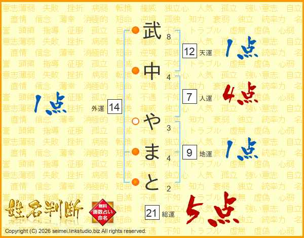 生活面を象徴する運勢です。外部から受ける影響力を表し、結婚運、家庭運や職場、環境への順応性を表します。総運から人運を引いた画数。姓や名が1文字の場合を除く。
