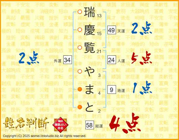 瑞慶覧やまとさんの総運は58画の4点!