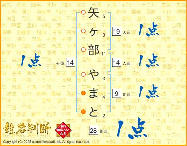 矢(5画)ヶ(3画)部(11画) や(3画)ま(4画)と(2画)