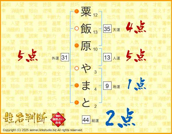 粟(12画)飯(13画)原(10画) や(3画)ま(4画)と(2画)