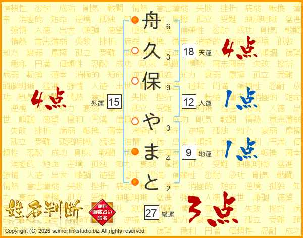舟(6画)久(3画)保(9画) や(3画)ま(4画)と(2画)