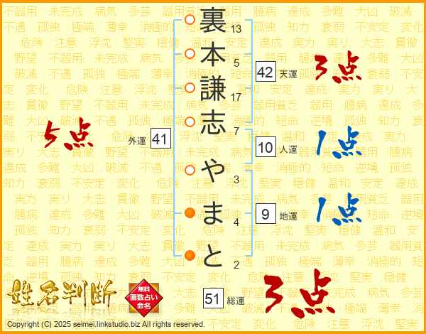 裏(13画)本(5画)謙(17画)志(7画) や(3画)ま(4画)と(2画)