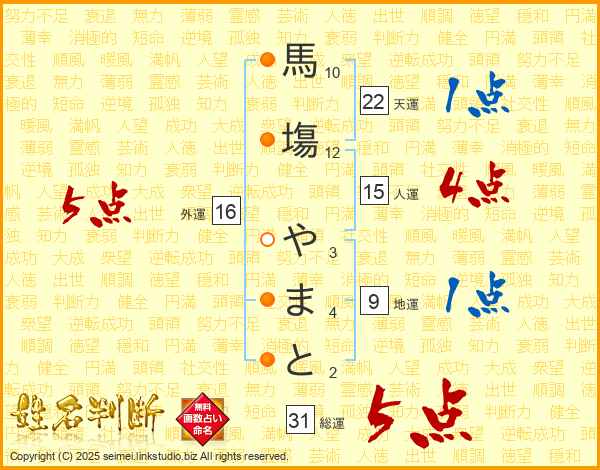 馬(10画)塲(12画) や(3画)ま(4画)と(2画)