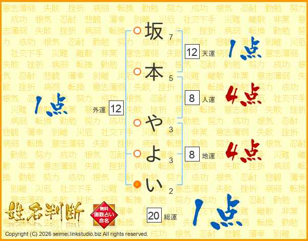 坂(7画)本(5画) や(3画)よ(3画)い(2画)