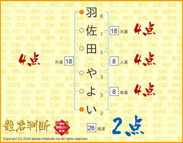 羽(6画)佐(7画)田(5画) や(3画)よ(3画)い(2画)