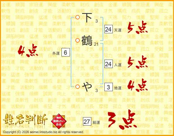 下鶴やさんの総運は27画の3点!