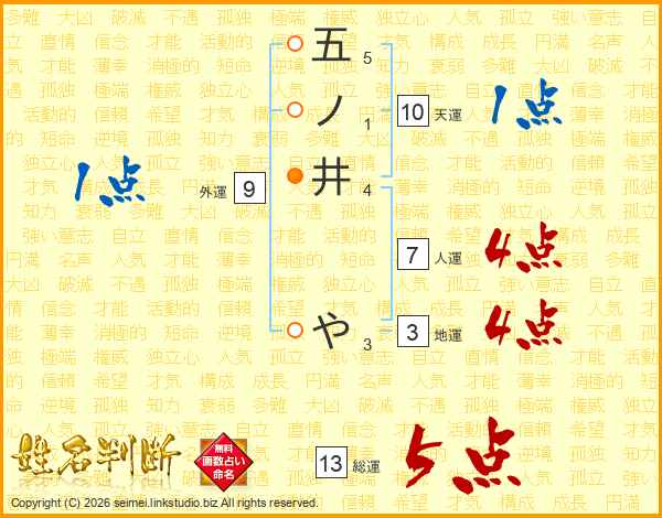 生活面を象徴する運勢です。外部から受ける影響力を表し、結婚運、家庭運や職場、環境への順応性を表します。総運から人運を引いた画数。姓や名が1文字の場合を除く。