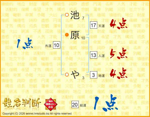 生活面を象徴する運勢です。外部から受ける影響力を表し、結婚運、家庭運や職場、環境への順応性を表します。総運から人運を引いた画数。姓や名が1文字の場合を除く。