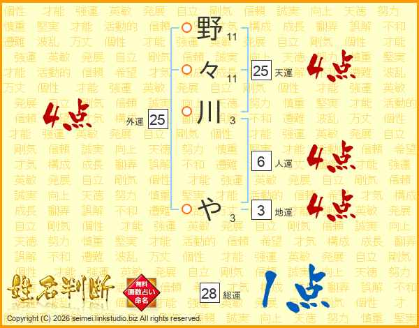 野々川やさんの天運は25画の4点!