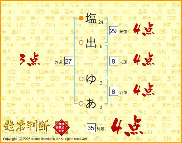 塩(24画)出(5画) ゆ(3画)あ(3画)
